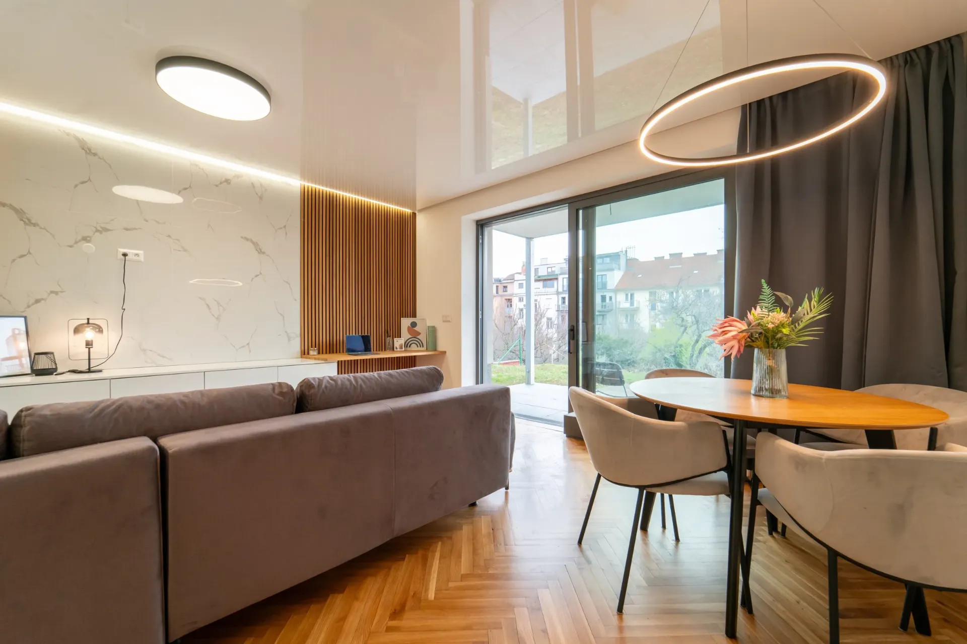 Dominantou tohoto bytu je přímé propojení interiéru s privátní terasou do zahrády. Vše orientováno do klidného vnitrobloku – ideální místo pro ranní kávu, relax s knihou nebo večerní posezení s přáteli.